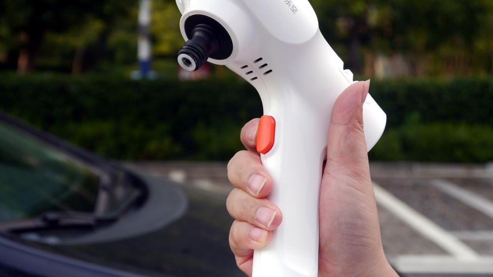 先来看看主机,这是一款便携式洗车机,人体工学式设计,握持很方便。纯白的机身,看着就干净。主机很轻便,包含电池的重量才1.1kg,也就是2瓶500ml矿泉水的重量,对于男同胞来说,全程单手洗车都没问题,而就算是女生,也一样能很好的操作。