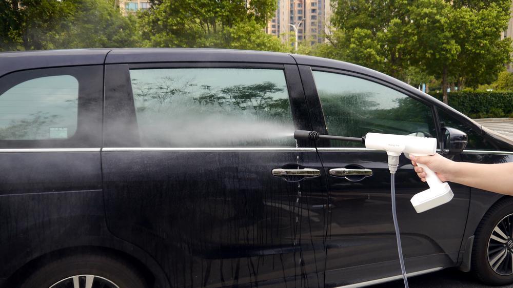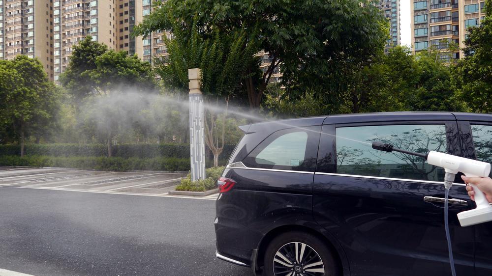 第四步就是冲洗了。这时你又需要把多功能喷头换上,实测喷头设计很科学,轻轻转动喷头就可以调节出水面。如果要清洗局部顽固污渍,你就需要把转动喷头到0度位置,如果是冲洗车辆,把喷头转到20-30度就可以了。当然,如果你要给宠物洗澡,那60度比较合适,如果你要用来喷雾降温或者浇菜浇花的话,80-120度更合适了。