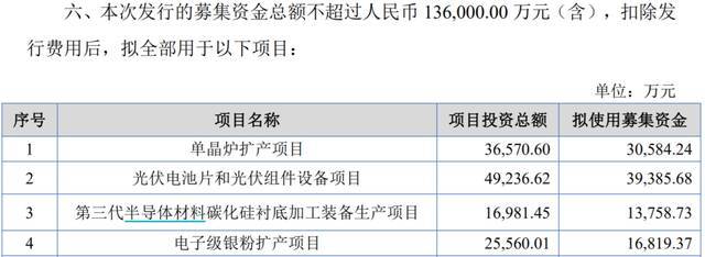 此前7月15日,连城数控发布定增草案,拟向不超过35名特定对象发行股票3900万股,募集资金13.6亿元,其中3.06亿元用于单晶炉扩产,3.94亿元用于光伏电池片和光伏组件设备项目,1.38亿元用于第三代半导体材料碳化硅衬底加工装备生产项目,1.68亿元用于电子级银粉扩产项目、以及剩余3.55亿元用于补充流动资金。
