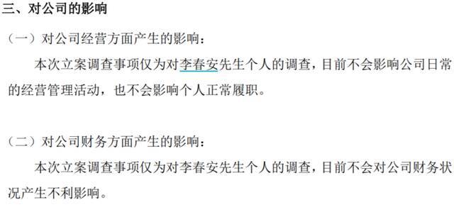 同时公告中还称,“经向李春安确认,其本次被立案事项涉嫌内幕交易标的并非本公司股票,且不涉及公司的相关事项。”