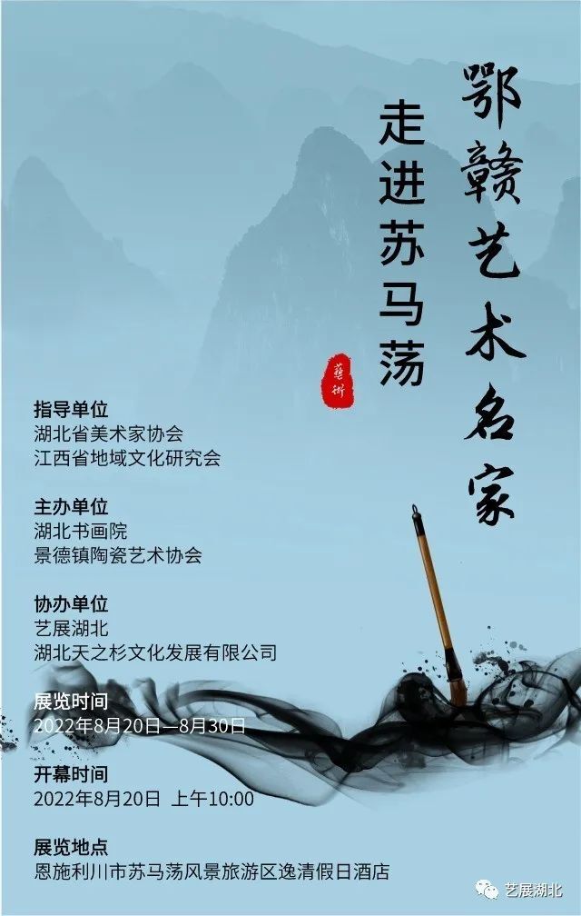 本次展览指导单位为湖北省美术家协会、江西省地域文化研究会,主办单位为湖北书画院、景德镇陶瓷艺术协会,协办单位为艺展湖北 、湖北天之杉文化发展有限公司。展览将持续在苏马荡风景旅游区逸清假日酒店二楼展出至8月30日,免费开放。