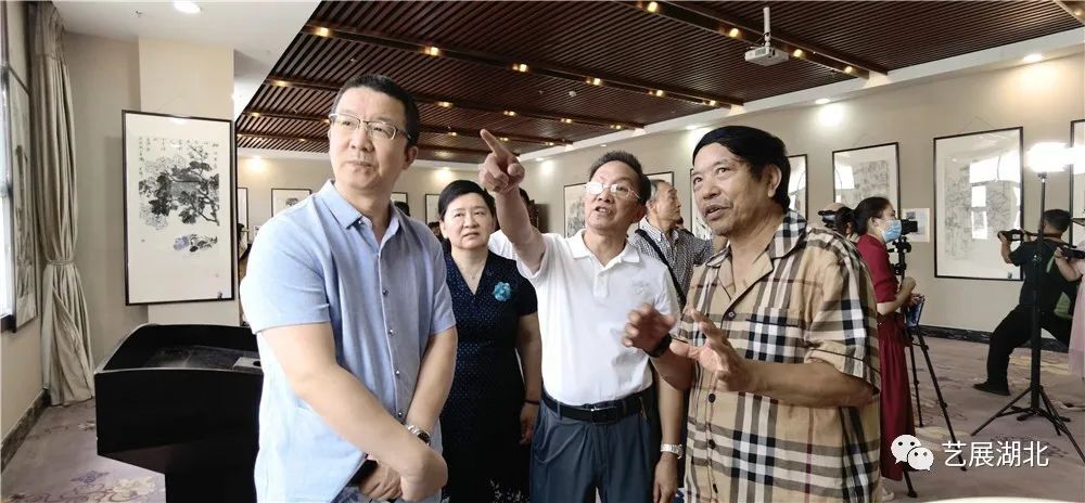 参展艺术家、湖北美院教授、湖北书画院副院长秦岭(右一)向张儒芝(右二)、湖北省文化和旅游厅二级调研员彭蓉(左二)、李和清(左一)介绍展出作品