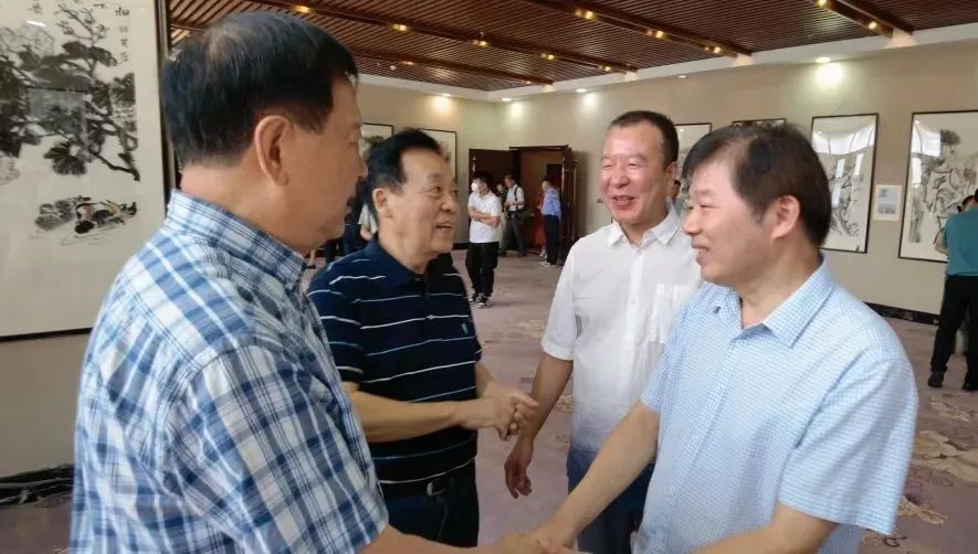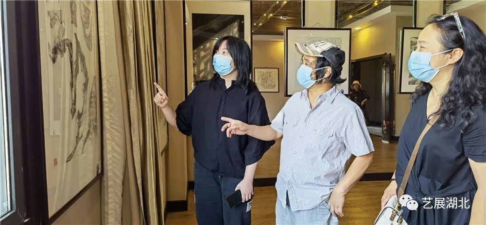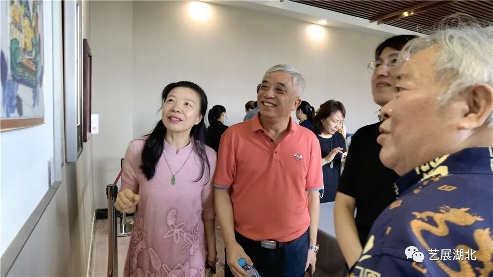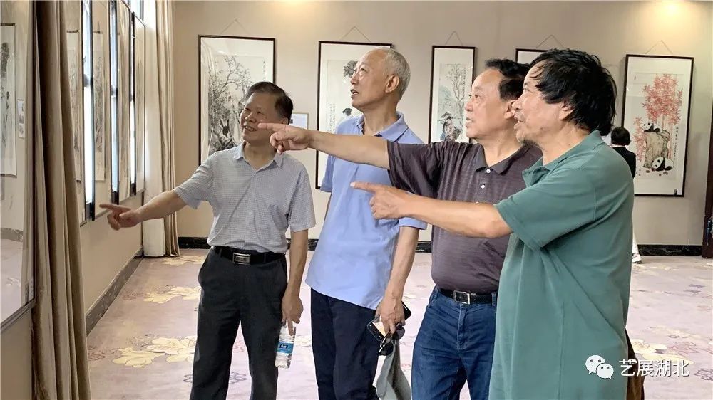 湖北美术学院教授周益民(左二)与参展艺术家、湖北师范大学教授、湖北书画院院士李也青(左一),参展艺术家、湖北省美术院中国画创作室主任、湖北书画院院士柳秀林(右二)一起观展