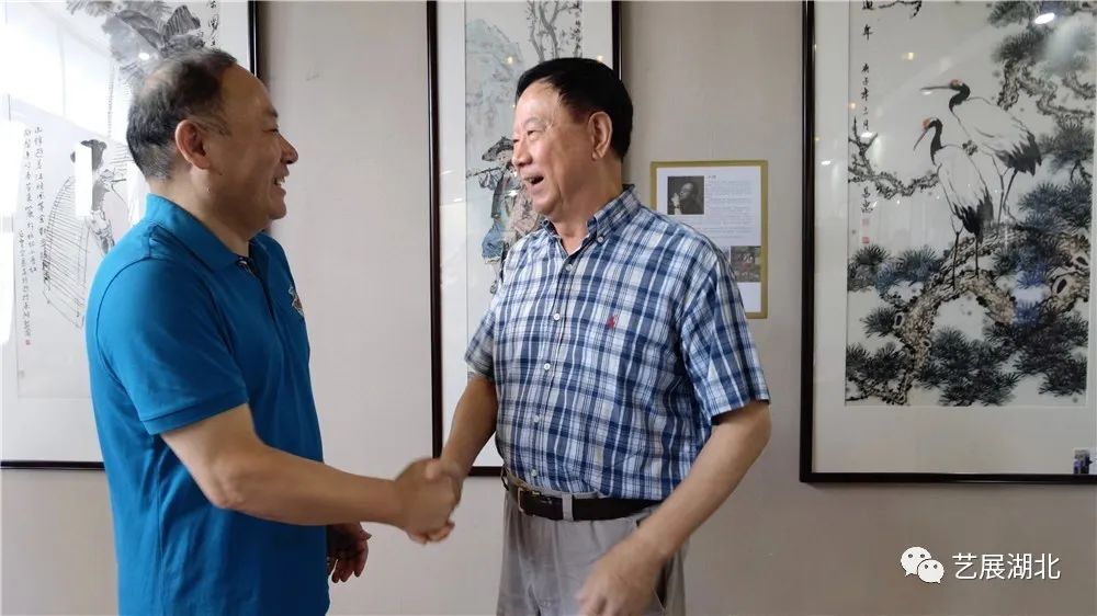 王少阶(中)称赞蒋昌忠(右一)的作品,湖北省美术院党委书记李和清(左一)