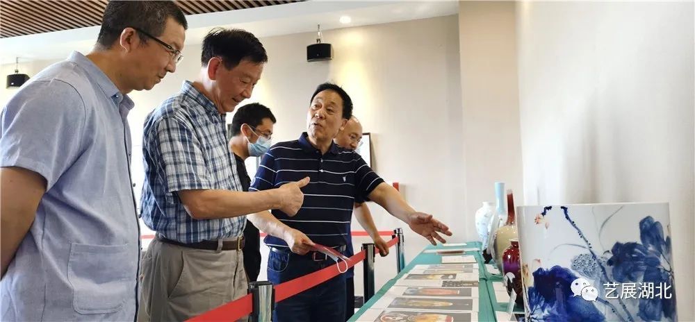 参展艺术家、景德镇学院教授张学文(右三)向王少阶(右二)介绍作品,湖北省文化和旅游厅原厅长、湖北书画院名誉院长蒋昌忠(右一)