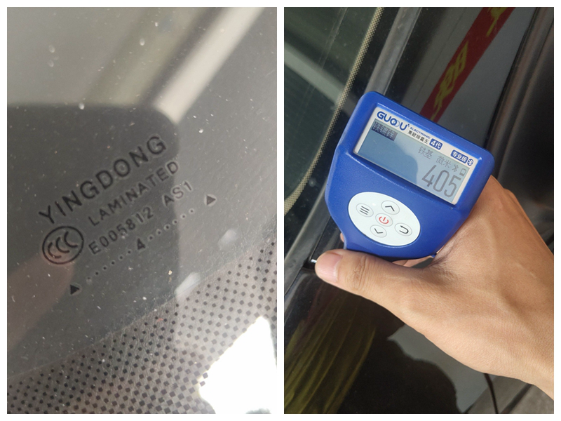 前挡风玻璃换掉了,YINGDONG这个牌子以前都没见过,一般见得多的是福耀牌子!换前挡应该跟A柱的刮蹭脱不了关系,看漆面厚度也是刮腻子了,虽然面积不大,但刮蹭力度应该可以把玻璃震裂!