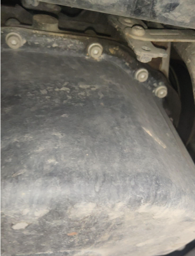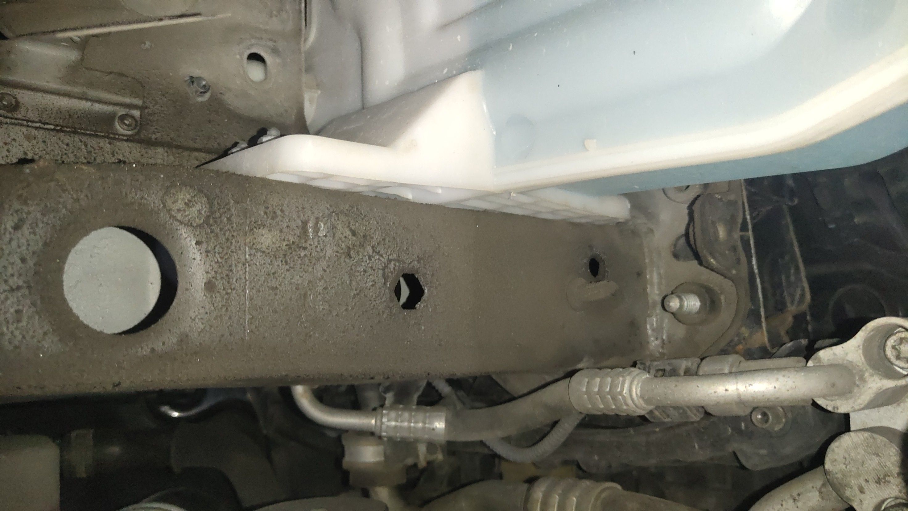 接着来到举升的地方,看看车辆的底盘!我们知道车头换了前嘴一套,现在从下面排查前纵梁,并未发现异常修复的情况,上面打孔的形状也并没有溃缩变形!