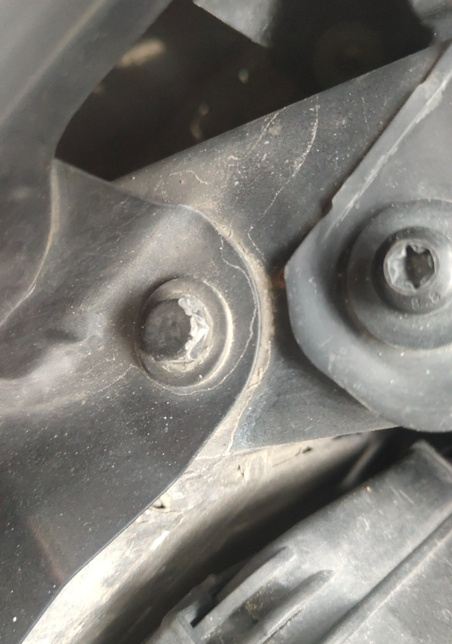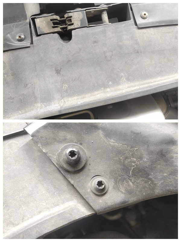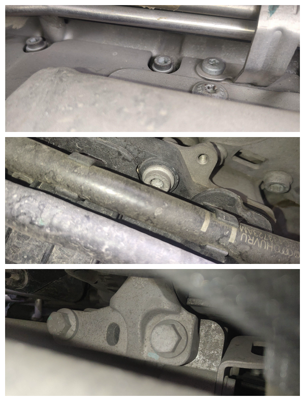 先排查发动机舱外围,机盖螺钉是拆过的,螺钉样式都不是原车的,基本4个螺钉4个样式,真的是廉价维修!机盖拆装,但是刚刚测量的钣金痕迹并不严重,没必要拆下来,所以机盖肯定更换了。