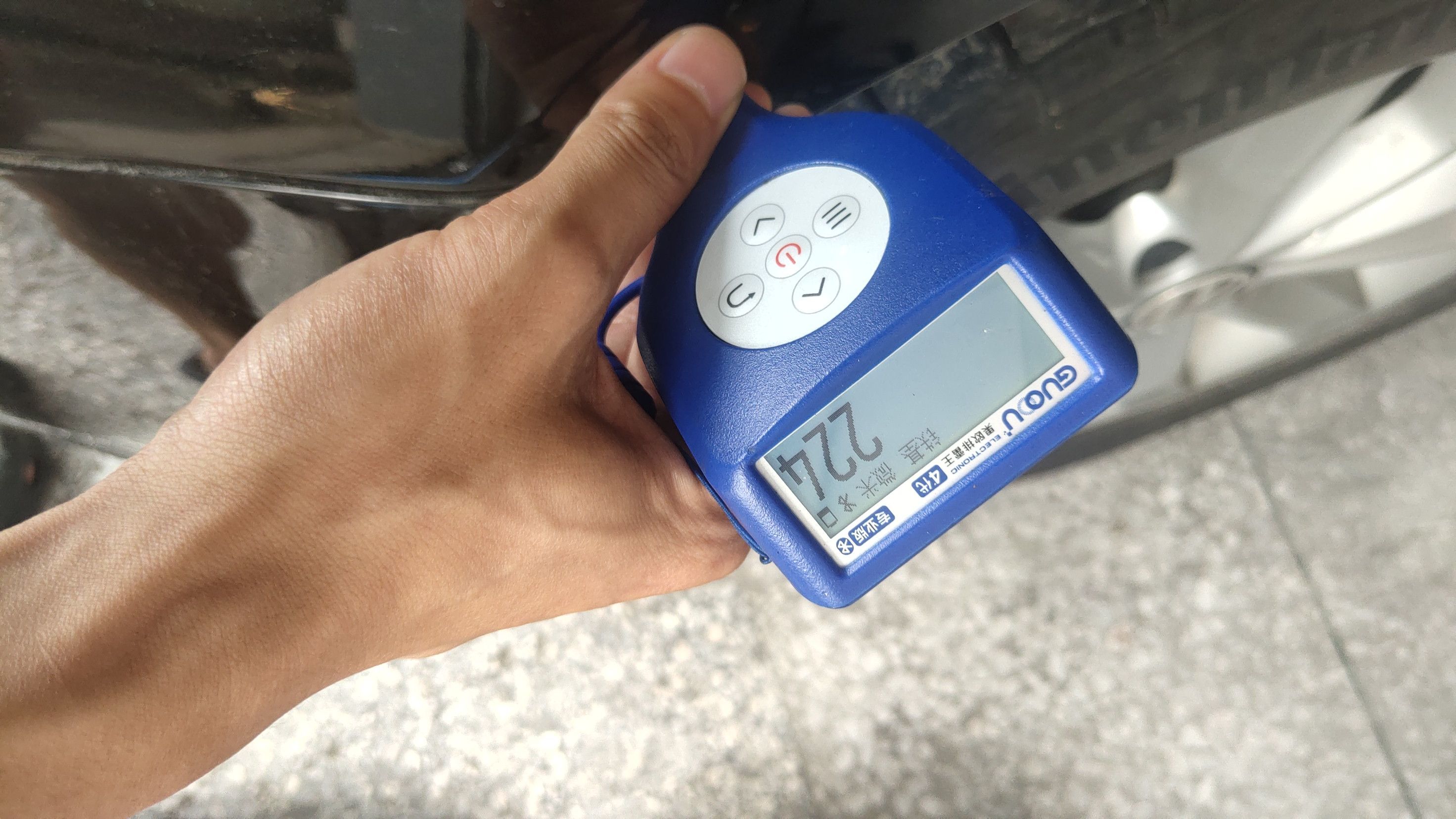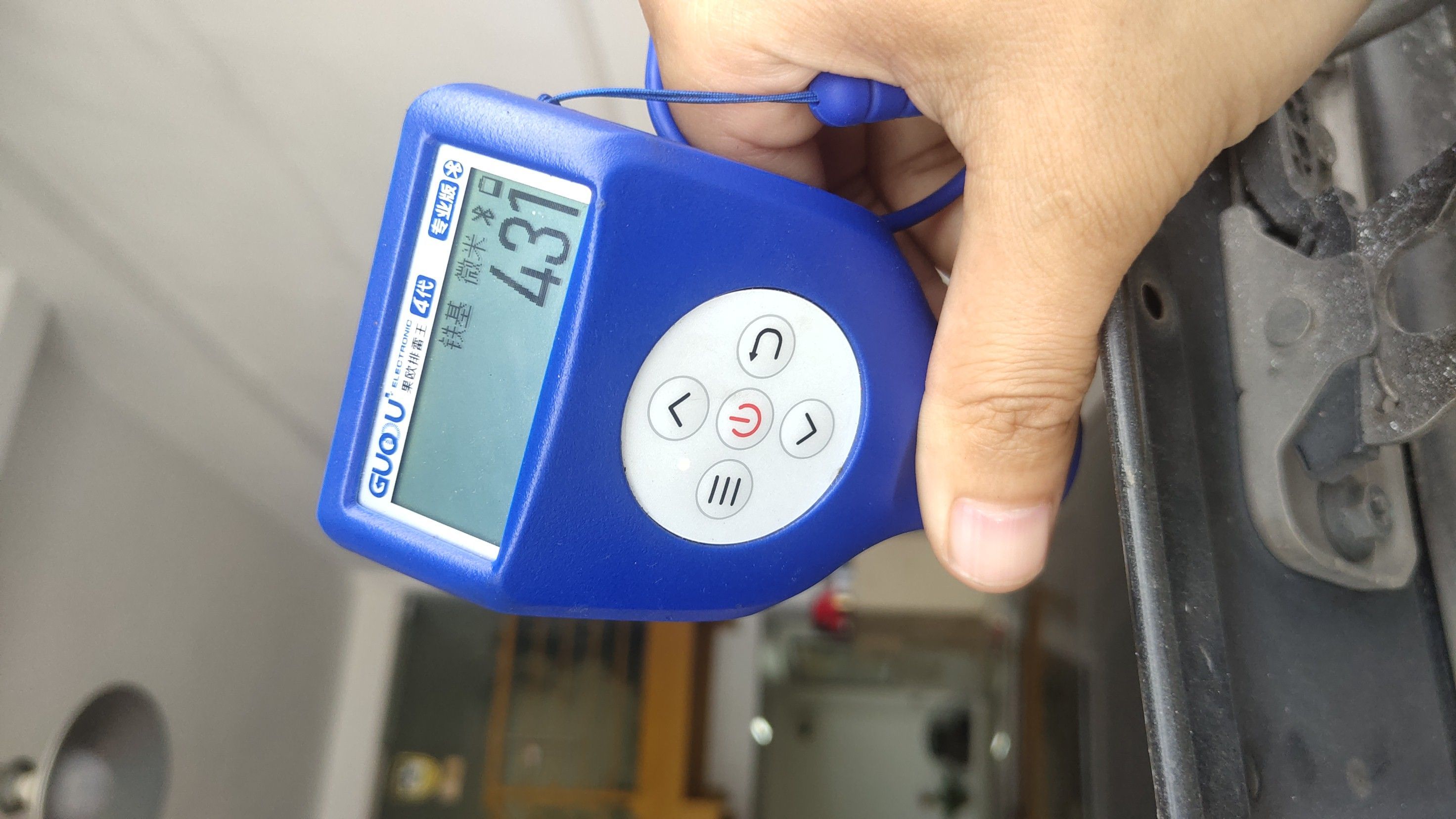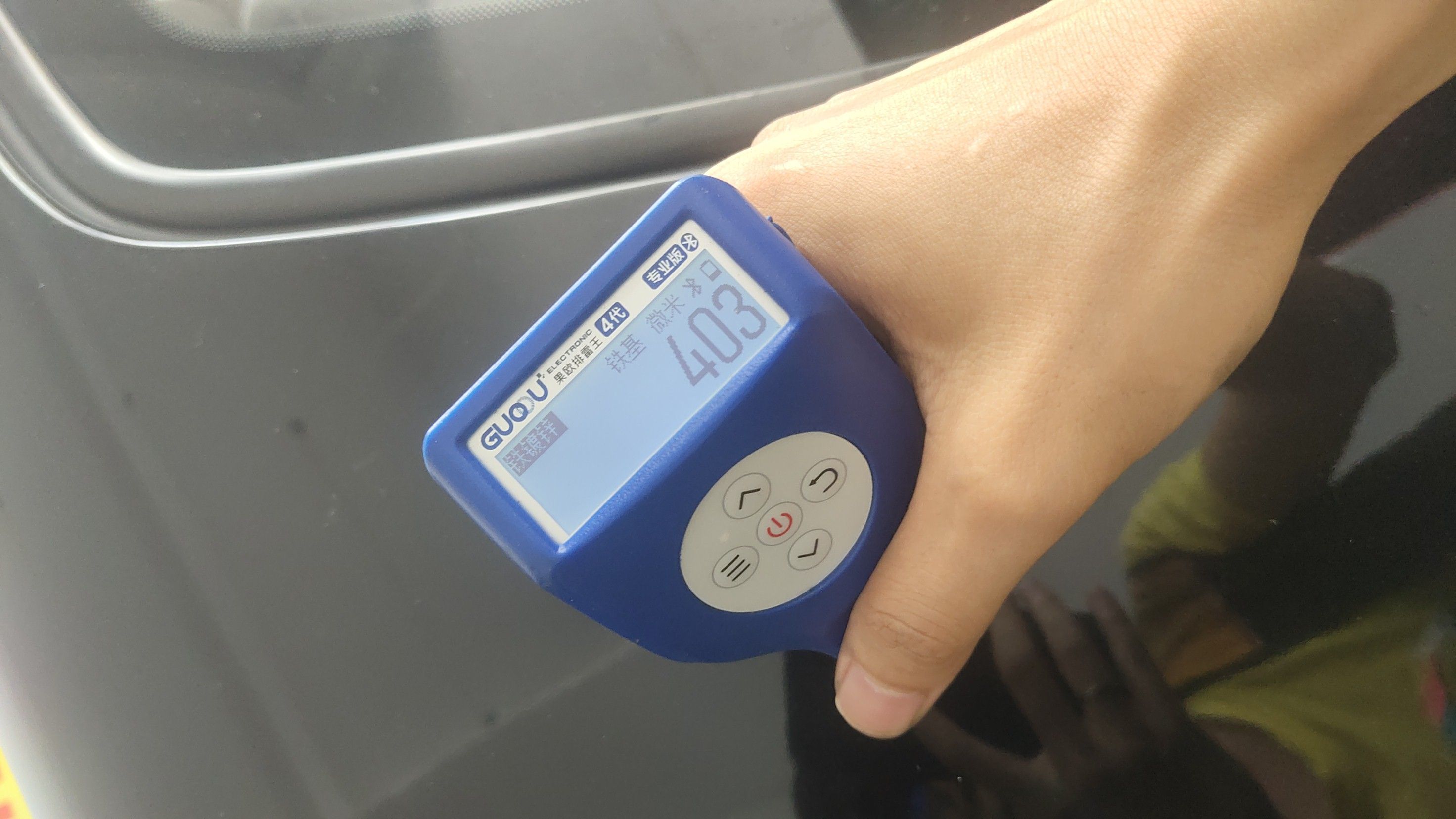 一上来就有情况,机盖的漆面厚度比较高,来到了400多μm,而原车的漆面厚度只有110μm左右,说明这个位置刮腻子了!而且这个位置很靠前,肯定是车头顶到什么东西了!