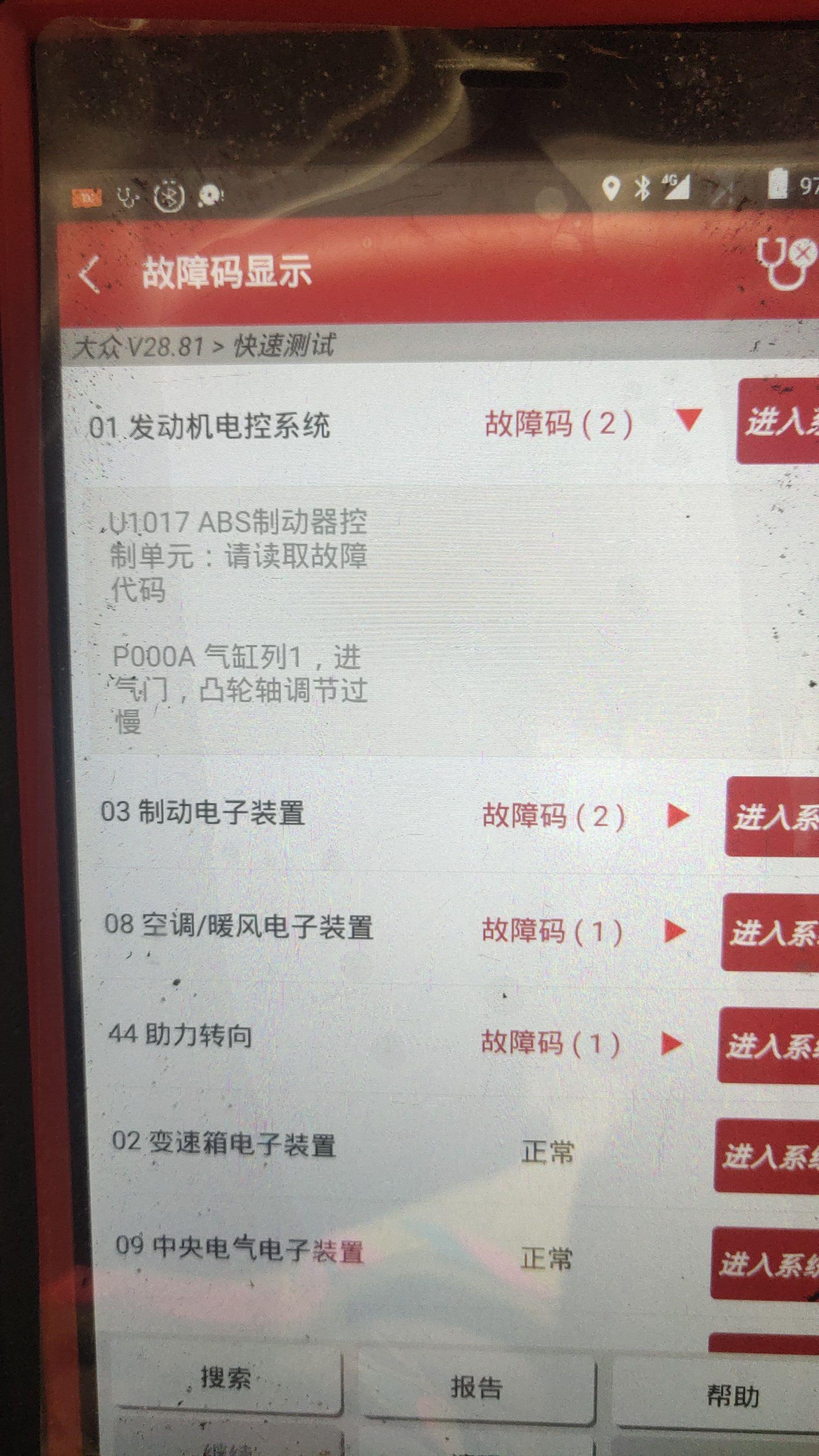 继续读取车辆的故障码,发动机电控系统报了两个故障码,一个ABS泵故障,一个凸轮轴故障,英俊这就无能为力了!不是简单的清除掉就行,得到修理厂仔细检查!