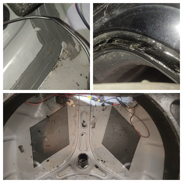 并且后围板的右下角位置存在二次打胶的痕迹,左下角位置还有明显的变形痕迹,说明车辆被追过尾!不过里面的备胎槽还是完好的,追尾应该不是特别严重,达不到中等烈度!