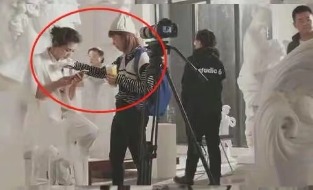 在片场休息的空档,明星看手机,助理用手去接她的漱口水。