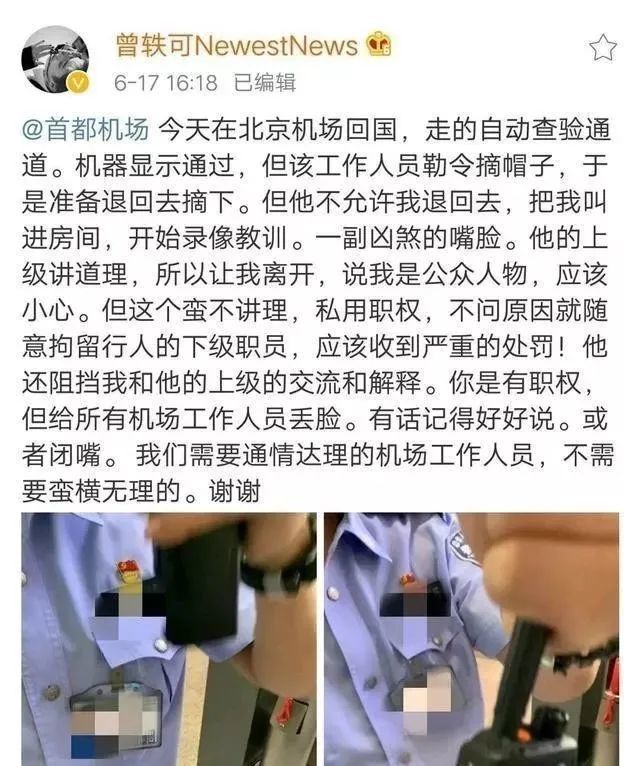 曾轶可曾发微博称,在首都机场过边检时,遭到工作人员的“无理刁难”,还被喊进房间录像“教训”。