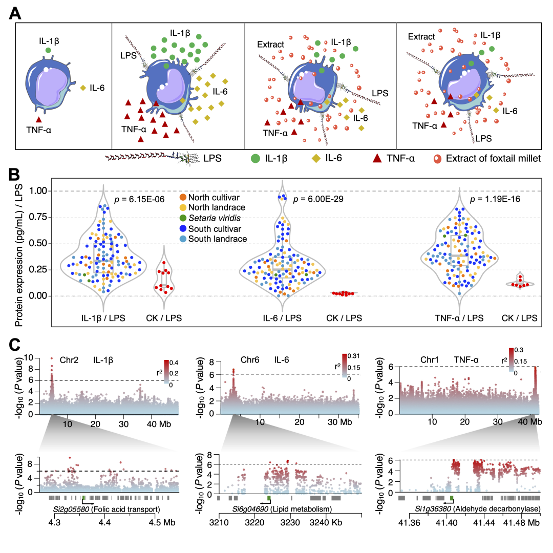 细胞因子因其抗炎功能而闻名。为了研究不同谷子粉末提取物的抗炎作用,作者检测了在1 μg/mL脂多糖(LPS)和200 μg/mL谷子粉末提取物共培养的RAW264.7细胞中IL-1β、IL-6和TNF-α的水平(图4A)。结果显示LPS处理显著提高了IL-1β、IL-6和TNF-α的水平,而培养液中添加谷子粉末提取物则降低了IL-1β、IL-6和TNF-α的水平,与LPS处理相比,96%以上的谷子粉末提取物处理显著(P < 0.05)抑制这3种细胞因子的产生,部分谷子提取物的细胞因子水平甚至低于未处理的对照水平(图4B)。接着计算每个谷子提取物的抗炎指数并进行GWAS分析,在谷子第2、6和1号染色体上鉴定到与IL-1β、IL-6和TNF-α指数相关的显著位点,检测得到相关候选基因与叶酸转运(Si2g05580),脂质代谢(Si6g04690),醛脱碳酶(Si1g36380)相关,这些基因可能在谷子提取物的抗炎作用中发挥作用(图4C)。