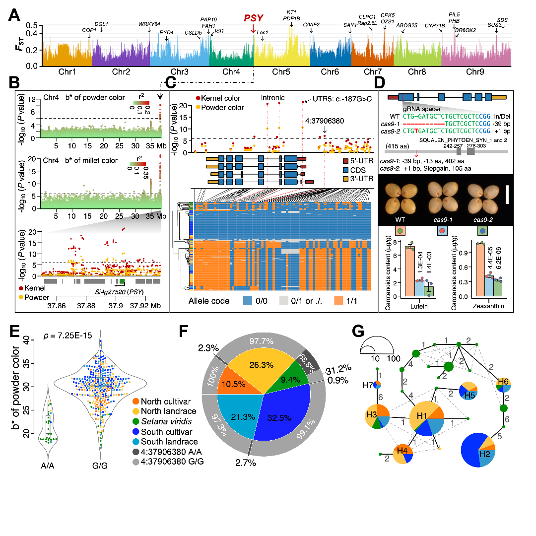 为了揭示谷子驯化的遗传基础,作者鉴定了57个与主要农艺性状相关的受选择的基因组热点区域;通过对拟南芥、水稻同源基因的基因研究,发现这些基因与籽粒产量、籽粒大小、株高、分蘖数、抽穗期、耐旱性、抗寒性、耐热性、类胡萝卜素含量、糖含量、叶绿素含量、光合能力和谷子颜色等主要农艺性状相关。其中PHYTOENE SYNTHASE1(PSY1;Si4g27520)基因位于一个受选择区域,表明它很可能是一个驯化相关的关键基因(图3A)。