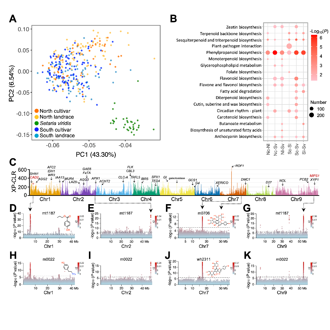 为了揭示在谷子中检测到的代谢物性状变异的遗传结构,作者使用TASSEL软件的混合线性模型(MLM)对所有398份谷子材料进行mGWAS分析(图1D),并结合生物学和生物信息学的方法,最终鉴定到与690个显著SNP相关的511个候选基因,这些基因可能与代谢性状的变异有关,这些分析提供了代谢组变异的遗传基础和潜在通路的功能见解。