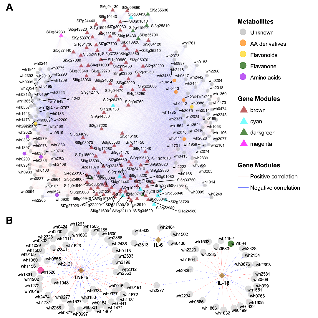 作者进一步通过对谷子籽粒灌浆中期转录本丰度、代谢物含量和抗炎指数之间的相关性分析,构建转录组、代谢组和抗炎特性之间的网络关系(图5)。在代谢-转录网络中共包含了9415对基因-代谢物,其中大多数基因来自与维生素B6和硫胺素代谢相关的“棕色”共表达模块(图5A)。利用套索回归模型,发现25、5和53个代谢物分别与IL-1β、IL-6和TNF-α细胞因子水平高度相关。此外还发现了具有抗炎特性的代谢物,如类黄酮、酰胺和有机酸。代谢抗炎因子网络显示,除了“wh1094”(柚皮素查尔酮、黄烷酮)和“wh1526”(5-O-p-香豆酰奎宁酸、氨基酸)外,大多数代谢产物并没有鉴定出其物质结构和类型(图5B)。已有研究表明这两种代谢物具有显著的抗炎活性。