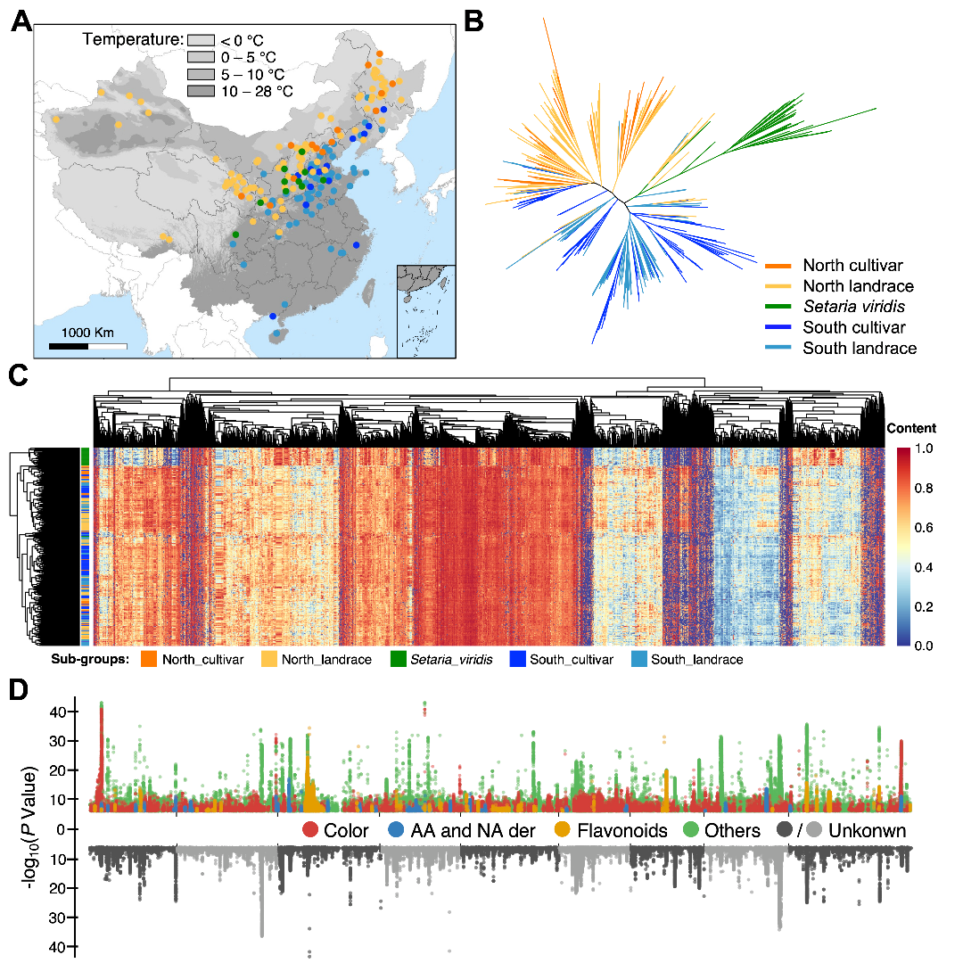 与小麦和水稻等其他谷类作物相比,谷子驯化的显著特点是脱壳后为黄色。大量地方品种和谷子变异种产生黄色籽粒,其颜色主要是由于果皮、糊粉和胚乳中积累的类胡萝卜素和类黄酮。此外,据《本草纲目》记载,中国古人早就认识到谷子对消化系统有好处,在中国北方,小米粥不仅是一种食物,而且还是一种“养胃”的食物。但是谷子的遗传变异与代谢物含量的遗传基础尚未明确。本研究中将结合重测序、转录组、代谢组等组学分析揭示谷子驯化选择中代谢物定向变化的遗传机制。
