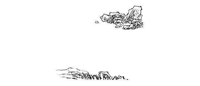 步骤2.向上加坡石,注意山石的走势和透视关系,而后用干笔皴出明暗,使山石坚硬有质感。