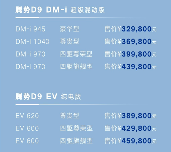 8月23日晚,划时代智臻豪华全能MPV腾势D9正式上市,新车在此前预售车型上增加了一款EV纯电版车型,共推出2个版本7款车型,售价区间为32.98万元-45.98万元,和1款创始限量版车型售价66万元。作为腾势品牌破局高端新能源MPV的扛鼎之作,腾势D9凭借比亚迪技术背书和奔驰品质标准赋能,开创了高端MPV新豪华时代,提供DM-i和EV两种动力,为用户打造出宜商宜家的全场景出行体验。