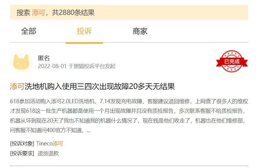 2.钱东奇治下,与科沃斯同袍的兄弟添可则屡屡陷入品控问题的争议中去,在黑猫投诉平台上搜索“添可”,共计2880条投诉结果,包括且不限于出厂故障但不予换货、产品二次售卖以及过退货期即坏等情况。