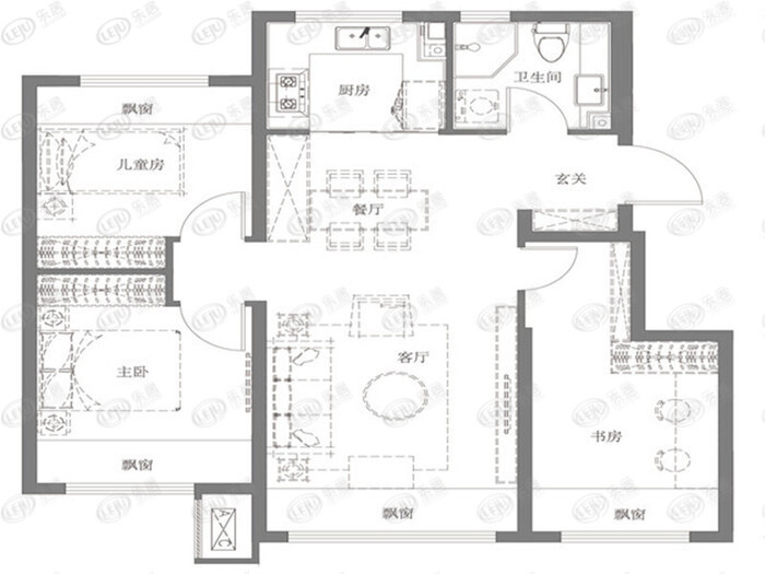 卧室、客厅、书房都有飘窗设计,增加家庭收纳存储空间。