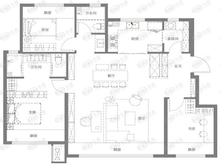 点评:户型方正,南向三面宽,皆附赠飘窗,增加空间功能性。