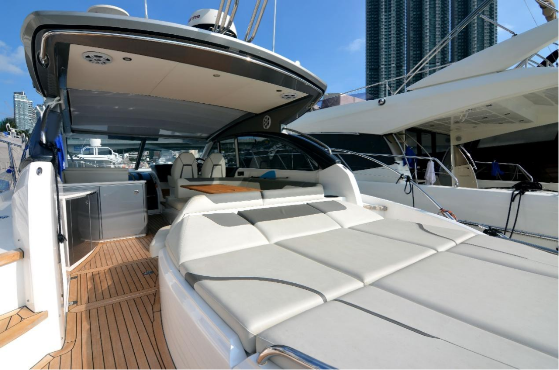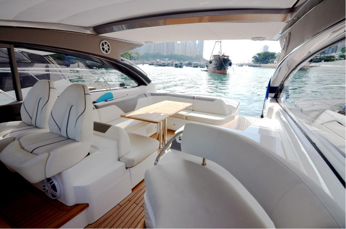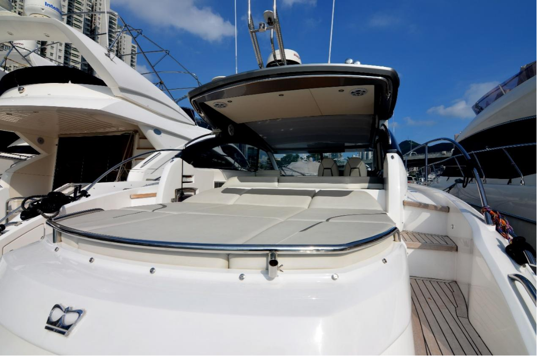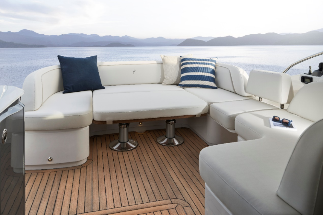 封闭式布局船尾甲板——空间宽敞,设计灵活,赋予其丰富的休闲功能,船尾的可升降餐桌,配合户外U型沙发,可灵活转换成日光浴床,自在地和朋友躺坐在任何喜欢的位置享受海风和阳光的美好。