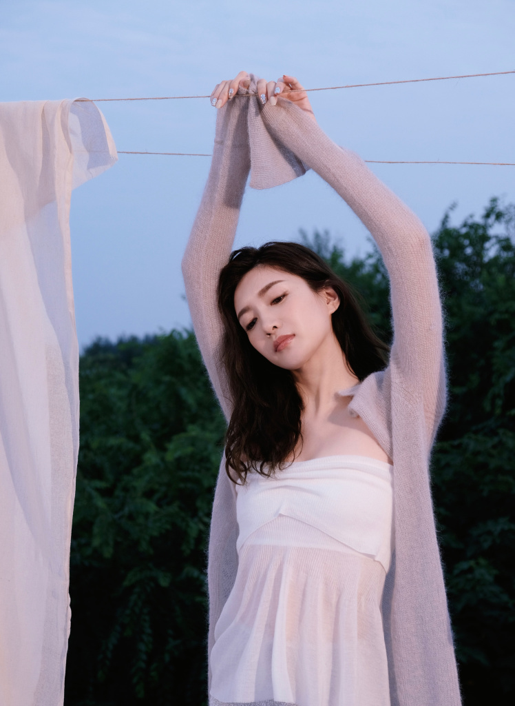 江疏影天台大片写真花絮释出 穿透视裙配灰色开衫出镜