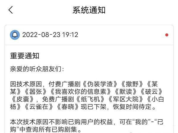 8月23日,一则“猫耳 下架”冲上微博热搜,很多人肯定一脸懵逼。点进去一看,原来是猫耳FM发布了一则公告:因技术原因,付费广播剧《伪装学渣》《撒野》《默读》《破云》《某某》《嚣张》《我喜欢你的信息素》《皮囊》,免费广播剧《纸飞机》《军区大院》《小白杨》《云雀在》《春晓》现已下架,恢复时间待定。以上广播剧的正剧内容的确无法在猫耳“剧集”一栏显示。