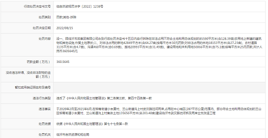 据信用临沂官网通报信息显示,限临沂市政集团有限公司收到行政处罚决定书十五日内自行拆除在非法占用不符合土地利用总体规划的85590平方米(合128.39亩)农用地上新建的建筑物和其他设施,恢复土地原状;对非法占用的耕地42849平方米(合64.27亩)按每平方米30元罚款;对非法占用的林地18153平方米(合27.23亩)、农村道路3135平方米(合4.7亩)、沟渠460平方米(合0.69亩)、园地20993平方米(合31.49亩)、建设用地和未利用地50066平方米(合75.1亩)按每平方米25元罚款,共计人民币3605645元。作出上述处罚的时间为2022年8月15日,处罚机关为临沂市自然资源和规划局。
