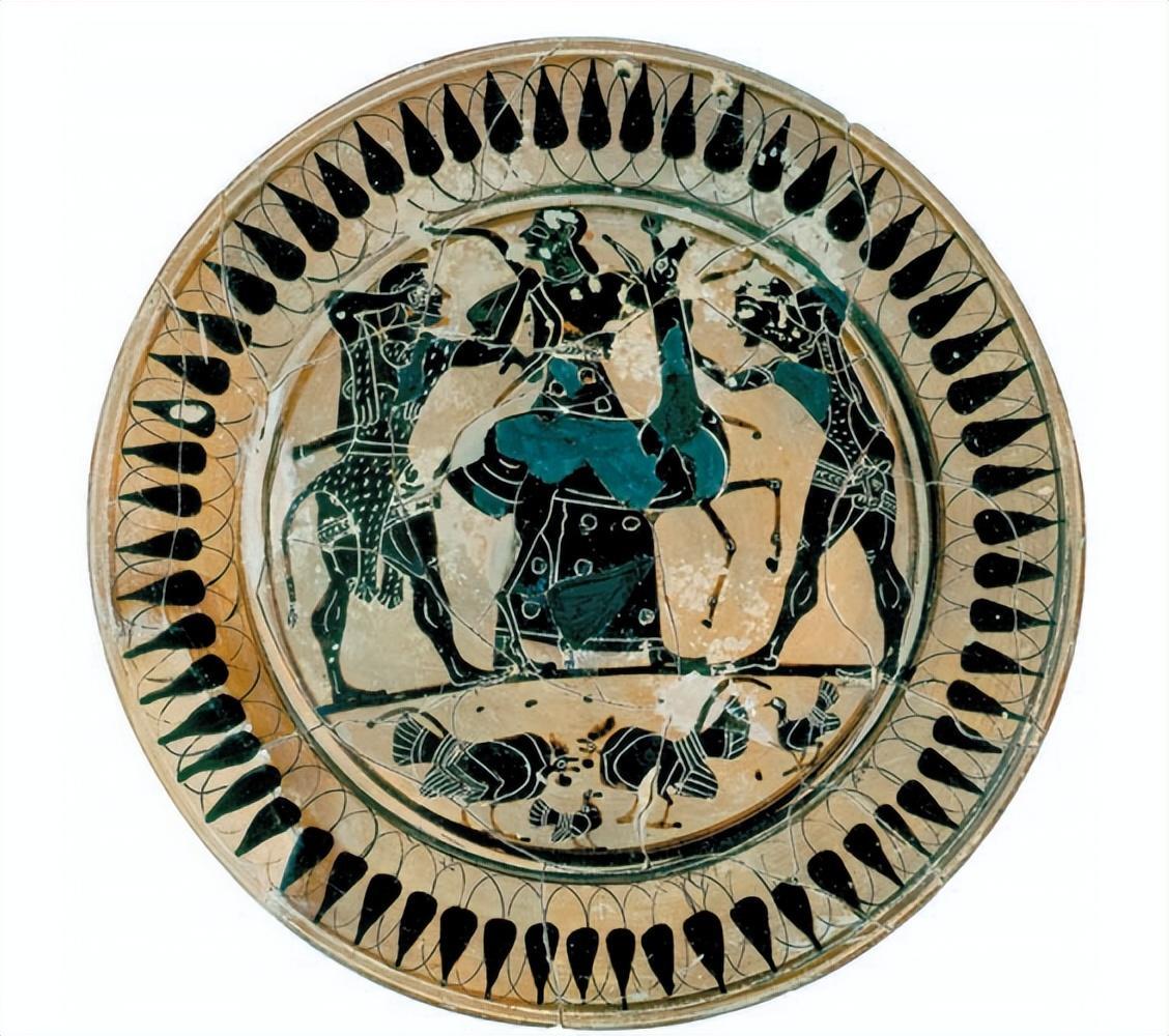 来自希腊的阿提卡黑绘盘子。图案为争夺刻律涅牝鹿,赫拉克勒斯和阿波罗拿着弓箭,为一头鹿自相残杀。一位女性(很可能是阿尔忒弥斯)在阻止他们。祭坛前,公鸡在母鸡面前争斗。约公元前550年,直径22.8厘米。
