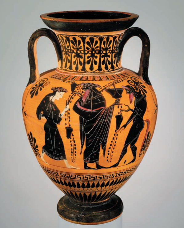 阿提卡黑绘双耳瓶。长着胡子的狄俄尼索斯在葡萄藤前挂着一个康塔罗斯酒杯(kantharos),站在迈那得斯(maenads)和萨提尔之间。约公元前510年,高39厘米。