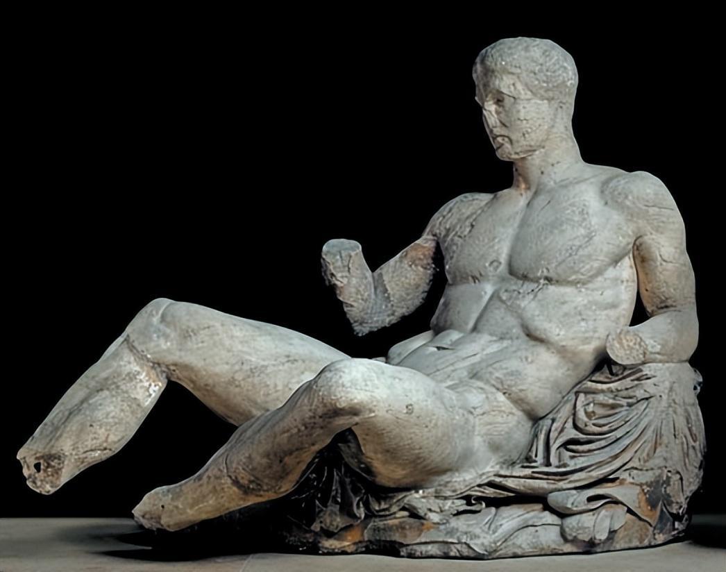 雅典帕台农神庙东侧三角楣饰的大理石雕塑。可能是狄俄尼索斯坐在兽皮上,手里还拿着康塔罗斯酒杯或者酒神权杖。约公元前440年。