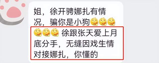 8月24日,徐开骋被曝多次深夜出入娜扎家中,二人疑似恋爱进行时。随后,又有娱记晒出多张聊天记录,直指娜扎卷入徐开骋与张天爱的三角恋爱中,而徐开骋也被质疑“出轨”,两段感情恐怕是无缝衔接。