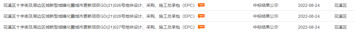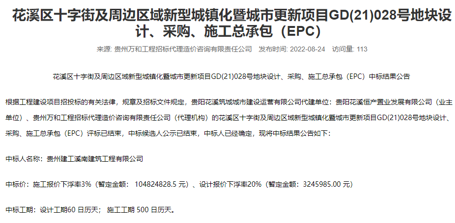 根据公示,花溪区十字街及周边区域新型城镇化暨城市更新项目GD(21)026、027、028号地块设计、采购、施工总承包(EPC)中标人均为为贵州建工溪南建筑工程有限公司,中标工期均为设计60天,施工500天。