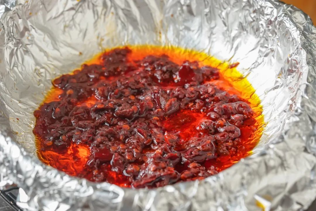 5. 倒油,让锡纸碗里底部铺满油,先用中小火把2勺郫县豆瓣酱炒出红油。