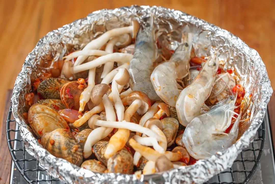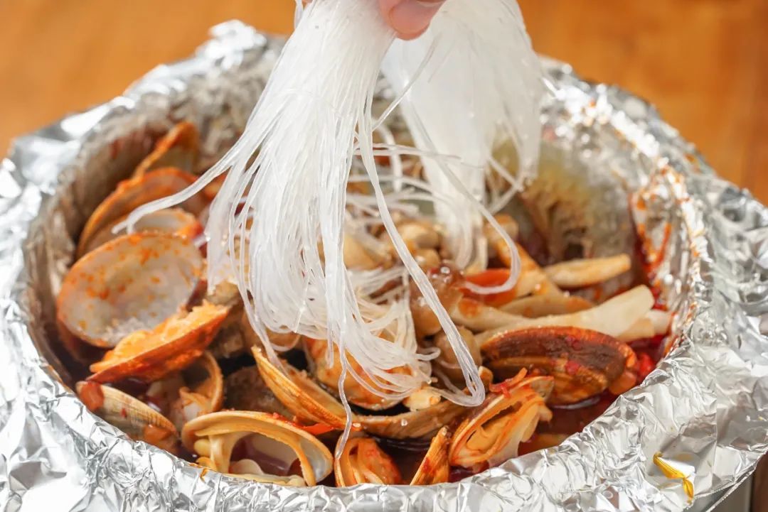 花甲粉得是锡纸包的,导热快,食物也能充分熟透入味。把锡纸窝成个碗的形状,直接放在火上煮开,豆瓣酱香、辣椒微呛。