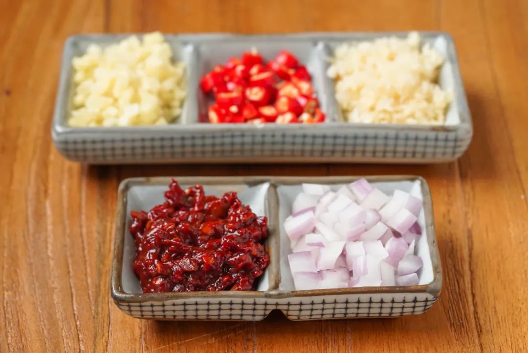 4. 3根小米椒洗净去蒂切圈,4瓣大蒜切成蒜泥,3片姜切成姜末,1撮小葱切成葱花,四分之一个洋葱切碎。