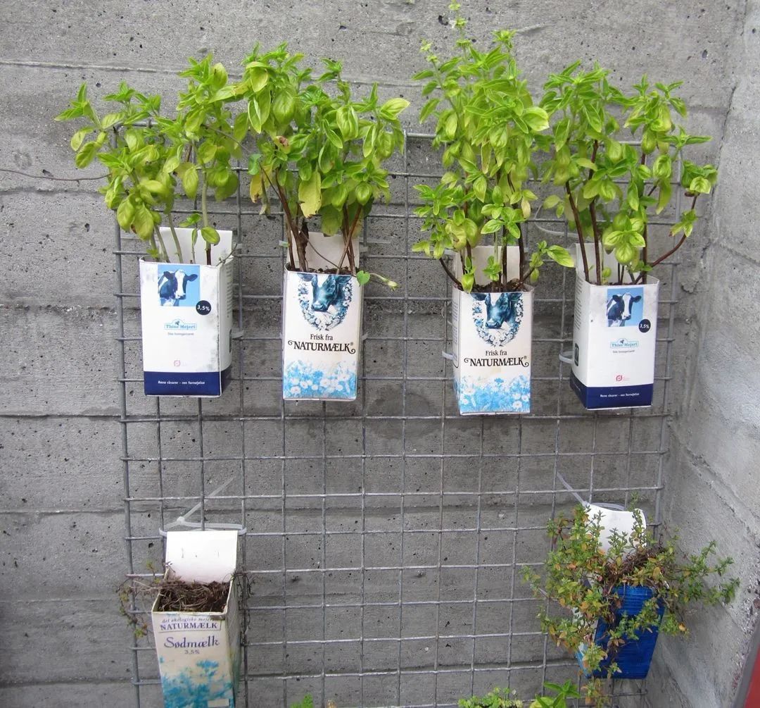 生活中,经常会产生各种的塑料容器,可以改造成栽种植物的花盆,空的牛奶盒也能变成一些非常精致的花盆,可以给它设置挂钩,将它悬挂在墙上,就变成了吊盆植物。可以将这些牛奶盒子用来栽种植物,要注意保证排水良好。