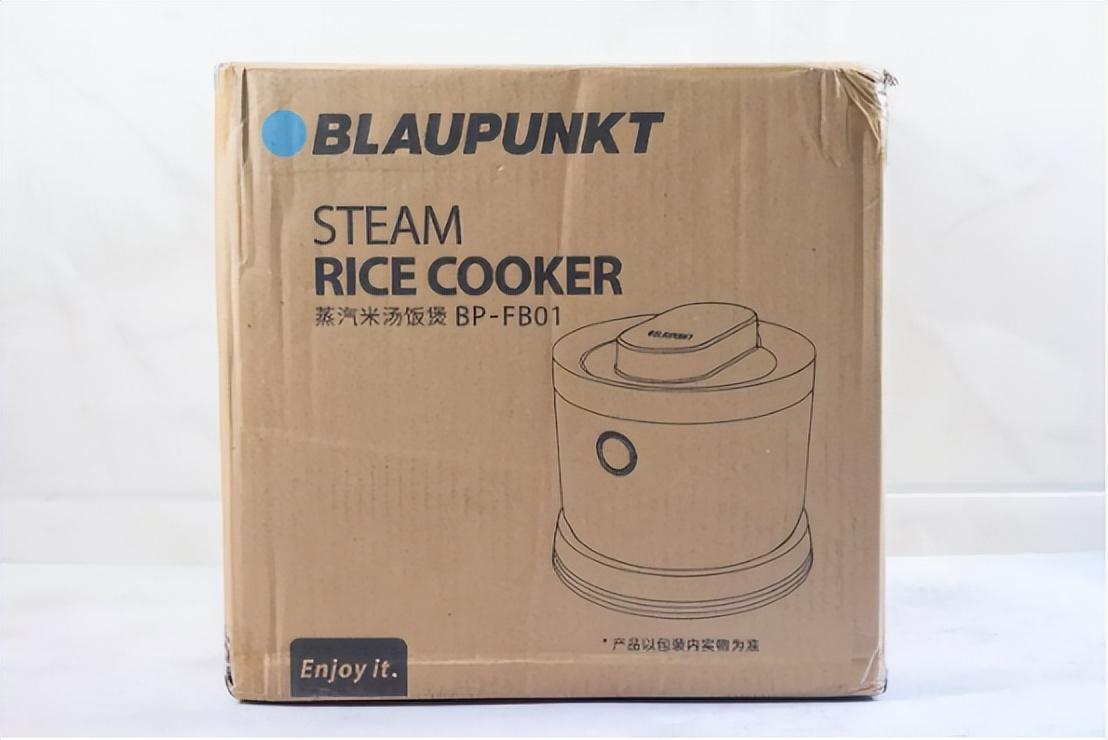 包装箱内含有蓝宝蒸汽电饭煲,电饭煲内还有内胆和蒸笼;底座,也就是米汤接水盒;饭勺,量杯,电源以及使用说明书。