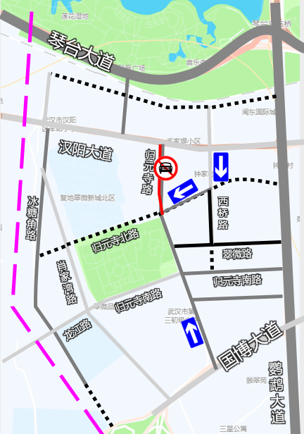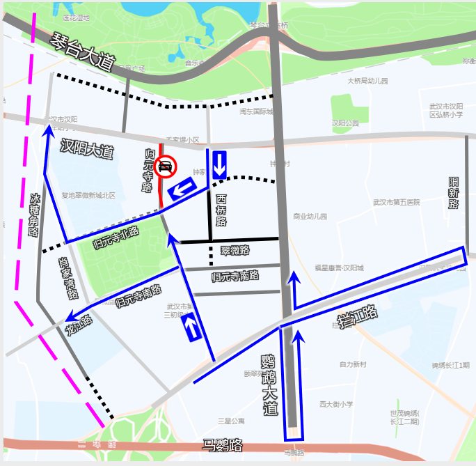 绕行建议:原南向北通行归元寺路施工路段往汉阳大道方向的过境车辆,可通过归元寺南路、归元寺北路、肖家湾路、拦江路、鹦鹉大道等周边道路绕行。