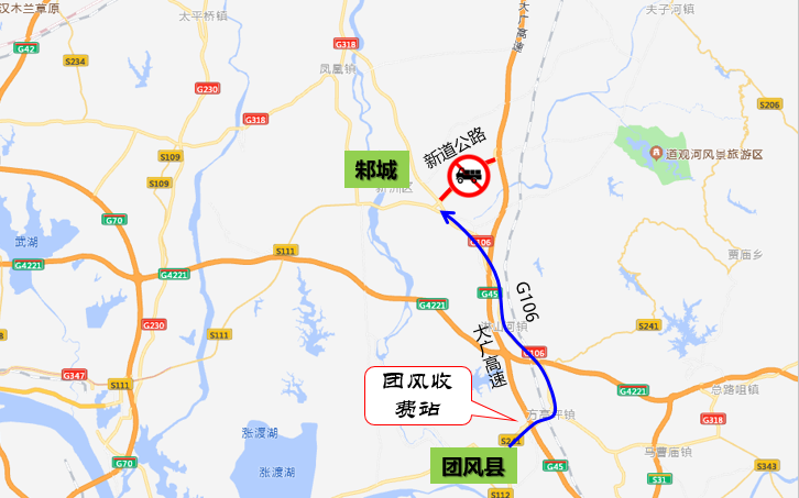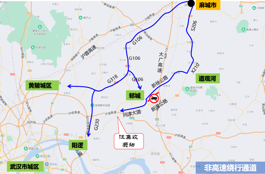 2、可经G106绕行去往邾城城区;经G106、G318绕行去往黄陂城区;经G106、G318、G230绕行去往阳逻城区;经S206、X210、新徐公路、问津大道绕行去往邾城城区或汪集收费站。