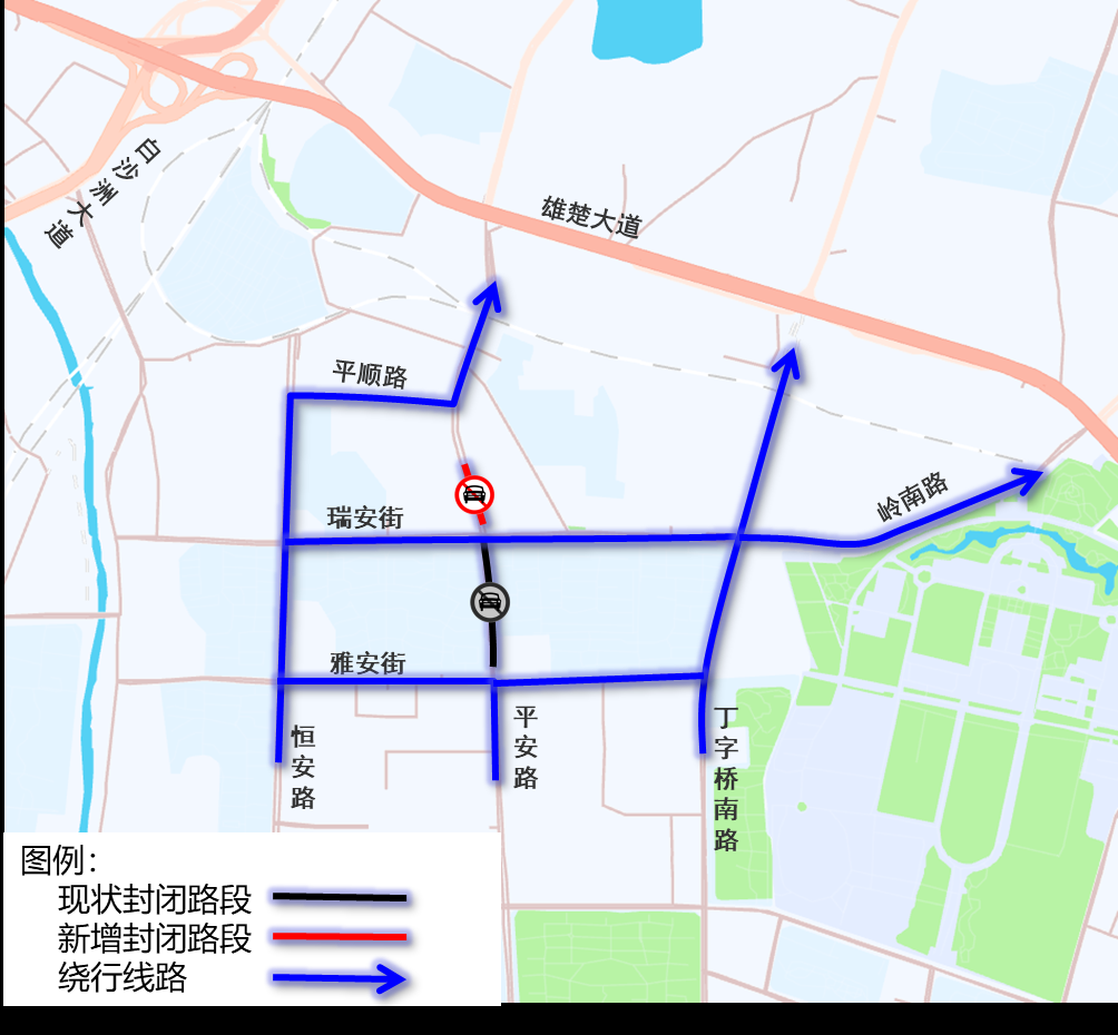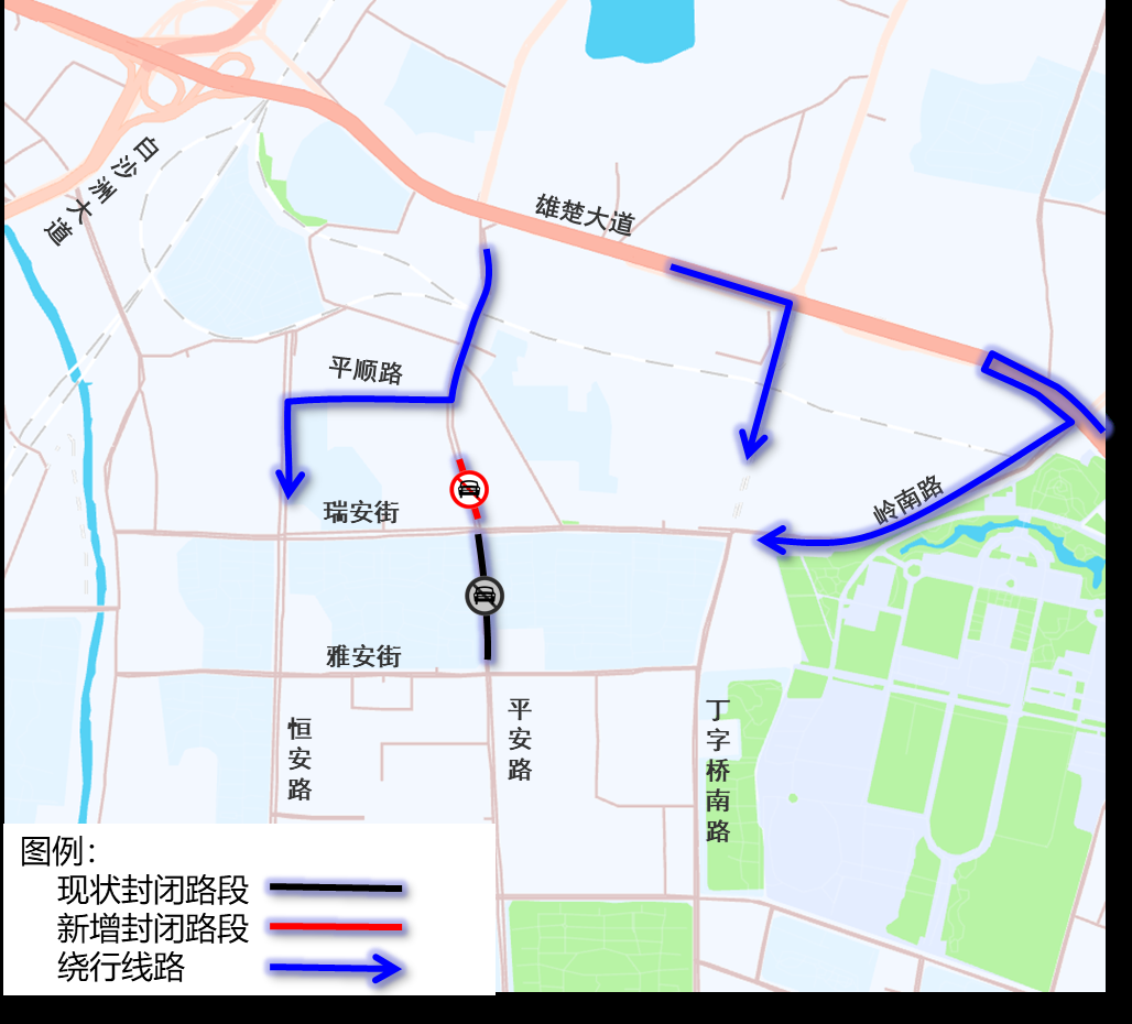 原通行平安路进南湖片区的车辆可绕行平顺路、恒安路,或通过雄楚大道绕行丁字桥南路、岭南路。