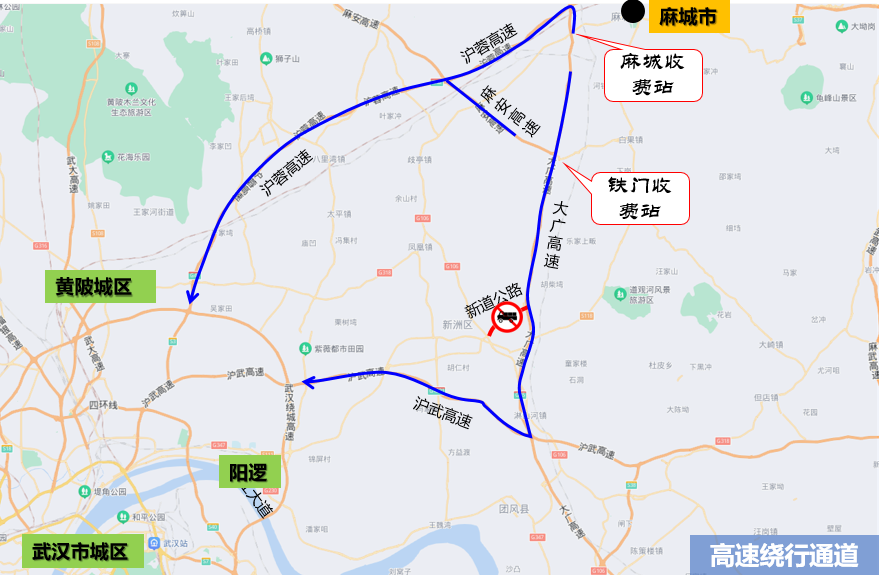 1、可绕行大广高速、沪武高速,或绕行麻安高速、沪蓉高速至黄陂、阳逻及武汉中心城区。