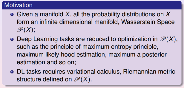 最优传输理论框架如图所示:我们考察一个黎曼流形上所有可能的概率分布,所有可能的概率分布构成一个无穷维的空间,即Wasserstein空间。深度学习的本质是在Wasserstein空间中优化,挑选出最佳的概率分布,使其满足某些观察(例如期望)并且优化某些能量(例如最大熵值)。