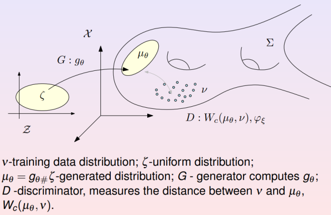 如上图所示,生成器将特征空间的白噪声映射到数据流形上的生成分布,判别器计算从生成分布到真实分布的映射,从而判断其距离。在优化过程中的任意一步,这两个映射的复合直接给出了隐空间上白噪声到数据流形上真实分布的映射,即GAN模型的目标映射。这意味着GAN模型中生成器和判别器的竞争应该被合作而取代,从而提高效率。这里的两个映射都是计算两个概率分布之间的变换,因此都需要用到最优传输理论。