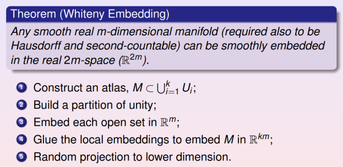 Whitney流形定理是说任意给一个m维拓扑流形,我们可以将其嵌入在欧式空间中,欧氏空间的维数大约是流形维数的两倍。现在很多深度学习的算法本质上就是Whitney定理的实现。Whitney定理的证明需要先用一族开集覆盖流形,将每个开集嵌入到欧氏空间,然后用所谓的单位分解把局部嵌入整体粘起来得到一个全局嵌入。这时嵌入空间的维数等于流形的维数乘以开集的个数,我们在将嵌入的流形依次向低维线性子空间投影,直至无法进一步投影,这时子空间的维数等于流形维数的两倍。