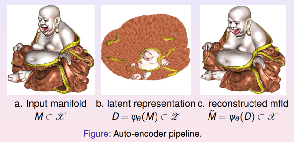 我们这里举一个简单的例子,我们用自动编码器学习弥勒佛曲面的拓扑结构。我们在曲面上均匀采样,将3000个采样点作为自动编码器的输入。编码映射将曲面展平到二维平面上,解码映射将平面像映回到三维空间。我们看到重建的曲面和初始曲面非常接近,所有精细的几何细节都被完美保持。这证明了编码解码映射实现了拓扑同胚。