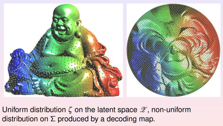 我们在最优传输映射的平面像上均匀采样,在将采样点拉回到三维曲面上。我们看到曲面上采样点分布依然均匀,这意味着这种编码映射保持了数据流形上本来的概率分布。